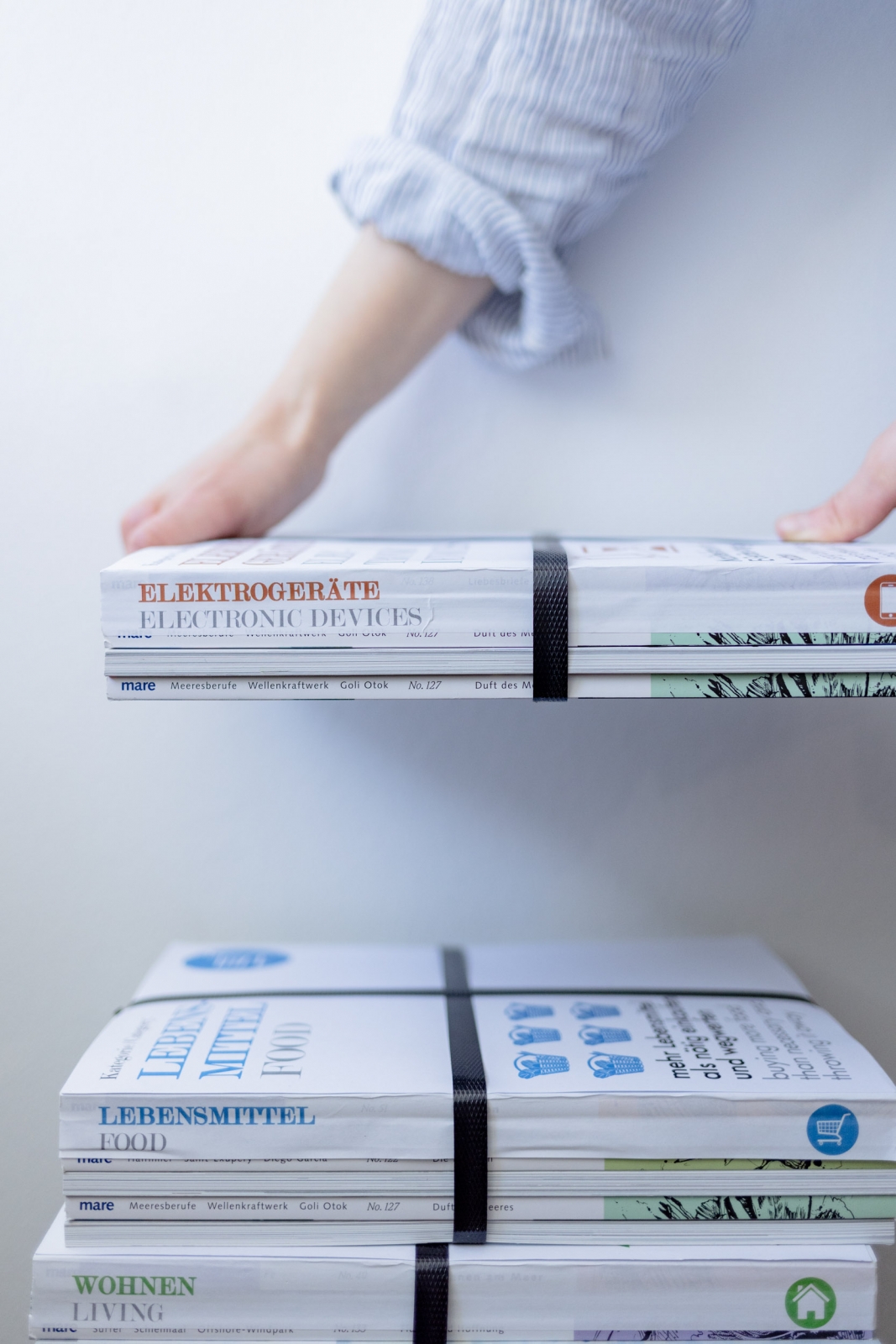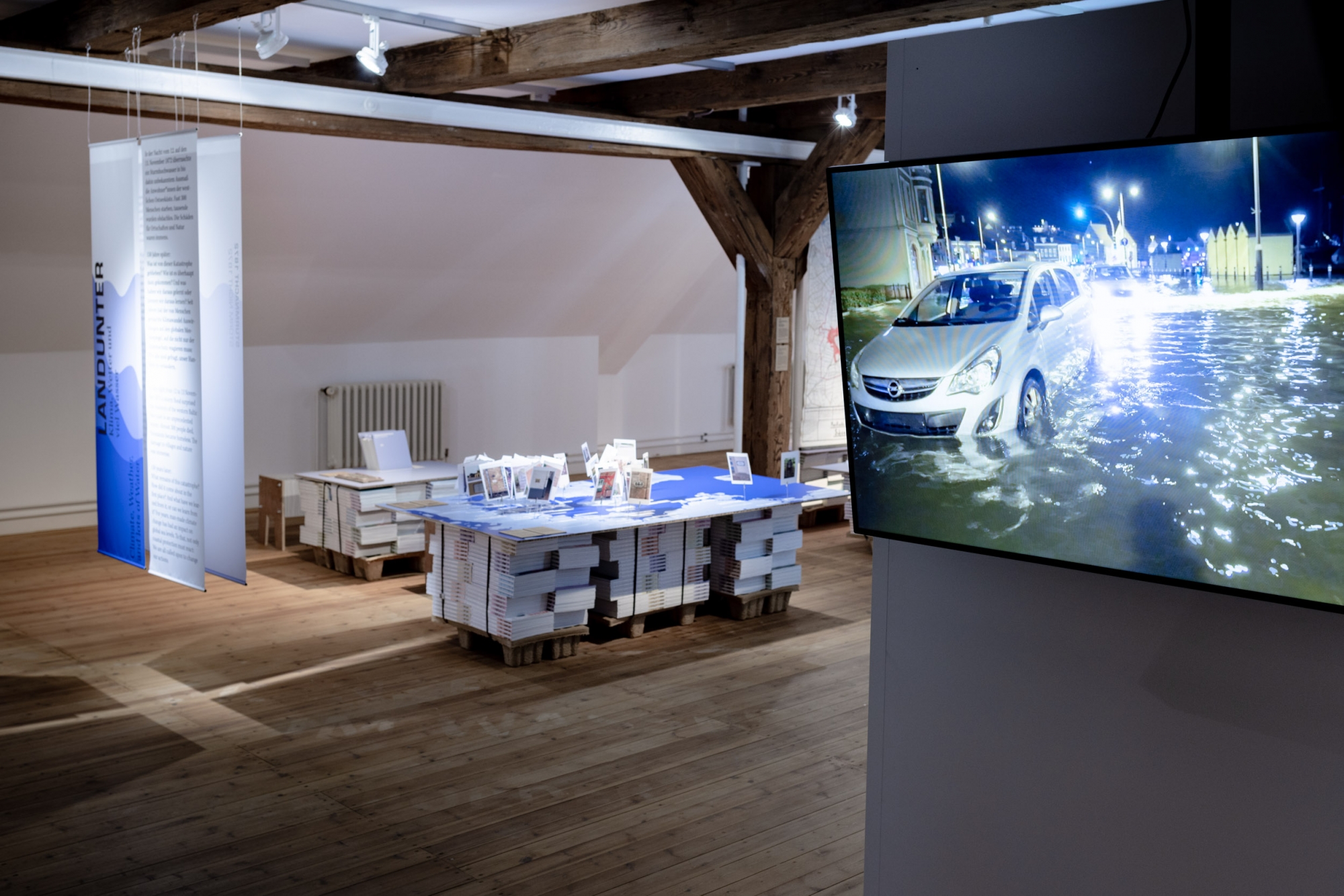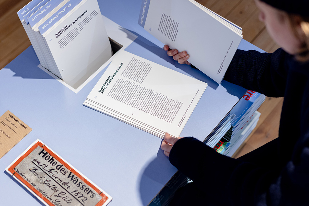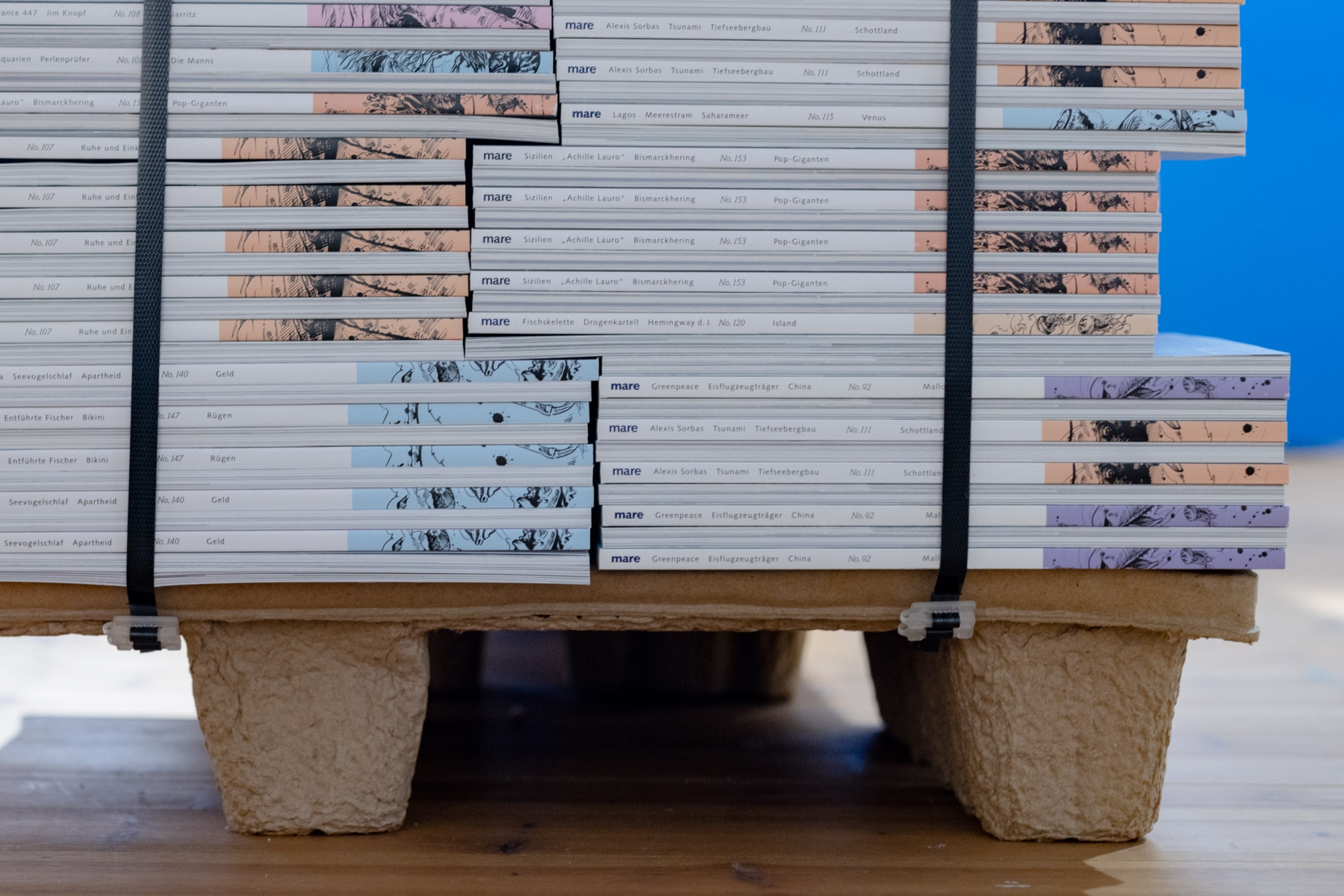 Die Ausstellungsgestaltung überträgt das Bild der Wassermassen und hohen Pegelstände über eine Materialflut in den Raum. Entstanden sind Sockel und Podeste aus insgesamt 8.000 gestapelten und geschnürten alten „mare“-Magazinen.
