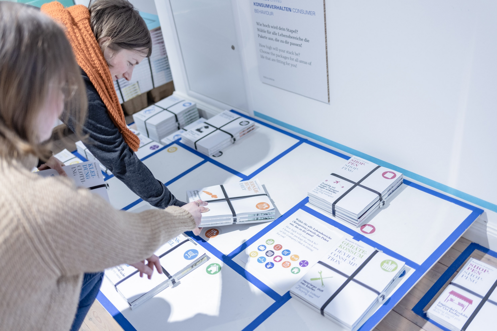 Die gestapelten Zeitschriften ergeben mit einem Fuß aus Papierfasergusspaletten und einer Deckplatte aus Wabenkarton die Sockel für die Exponate. Die Hauben für die Exponate stammen aus dem Museumsbestand. Am Ende der Ausstellungslaufzeit können die Zeitschriften von Interessierten gegen Spende mitgenommen werden.